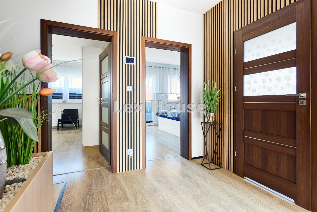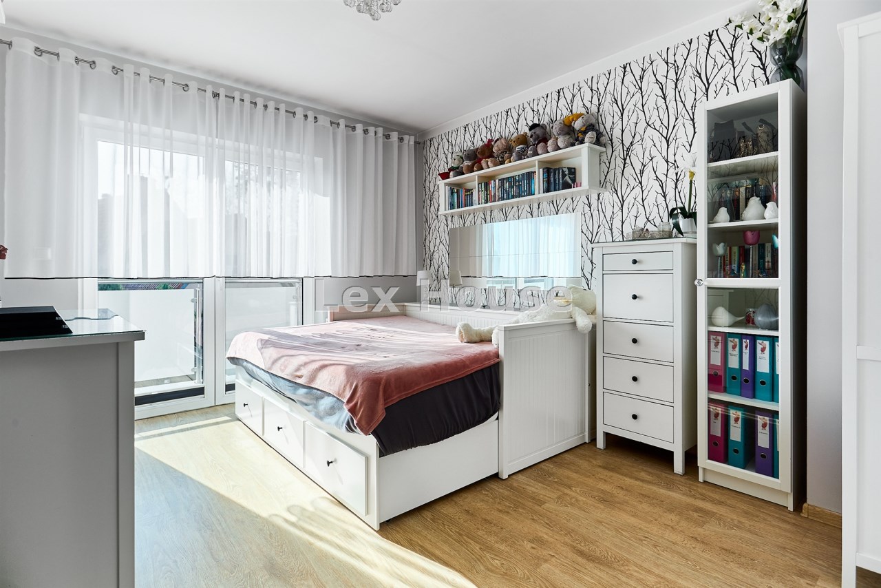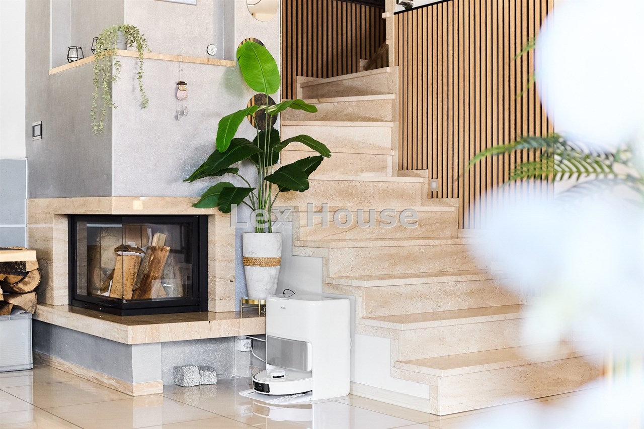 Na PIĘTRZE znajdują się cztery sypialnie – każda z własnym balkonem oraz przestronna łazienka wyposażona w wannę i prysznic. Wnętrza wykończono z dbałością o detale – marmurowe schody i parapety, solidne tynki, eleganckie tapety oraz wysokiej klasy panele podłogowe.