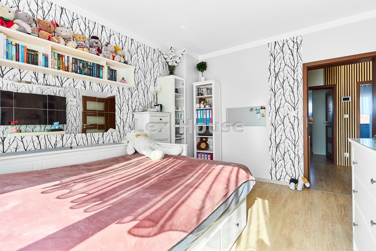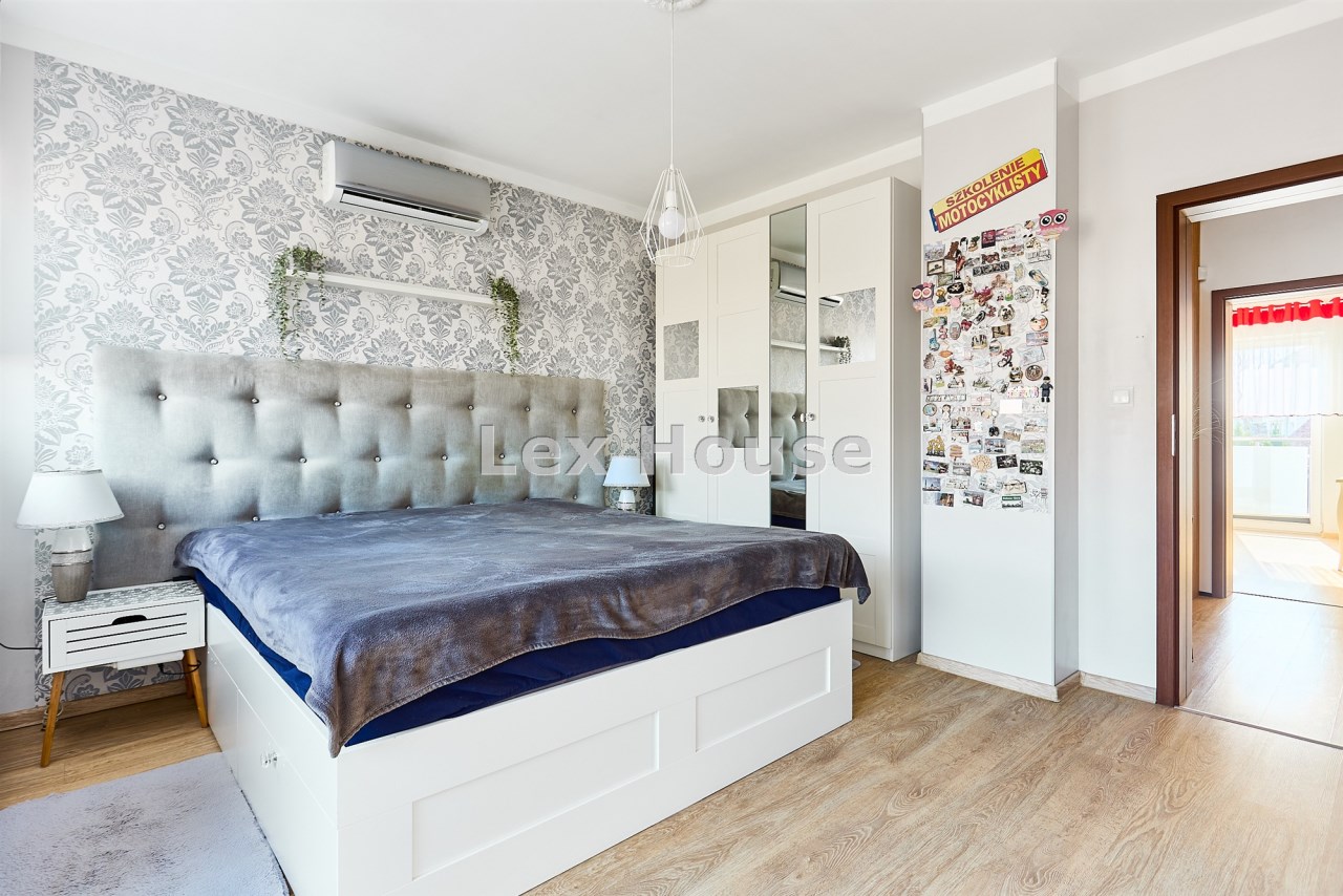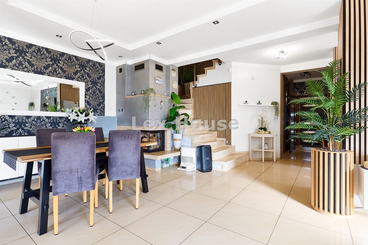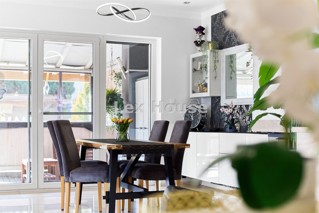 Na PIĘTRZE znajdują się cztery sypialnie – każda z własnym balkonem oraz przestronna łazienka wyposażona w wannę i prysznic. Wnętrza wykończono z dbałością o detale – marmurowe schody i parapety, solidne tynki, eleganckie tapety oraz wysokiej klasy panele podłogowe.