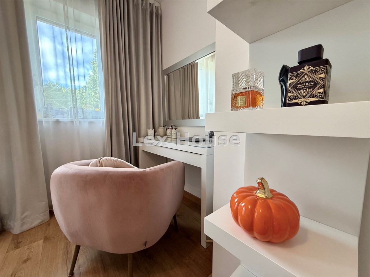 Wnętrze domu obejmuje 5 pokoi, w tym 4 sypialnie z czego jedna została zagospodarowana na garderobę, co zapewnia wygodę nawet dla dużej rodziny. Budynek z garażem w bryle i bezpośrednim wejściem do części mieszkalnej.