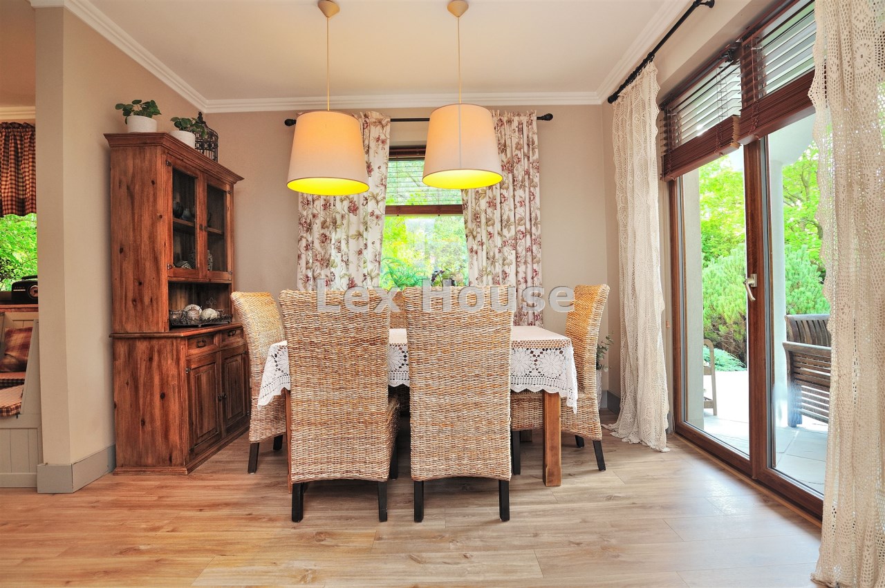 Wnętrza zostały zaprojektowane z myślą o wygodzie domowników. Przestronny, jasny salon z kominkiem stanowi centrum życia rodzinnego. Z salonu prowadzi wyjście na taras i do ogrodu, co sprzyja odpoczynkowi na świeżym powietrzu.