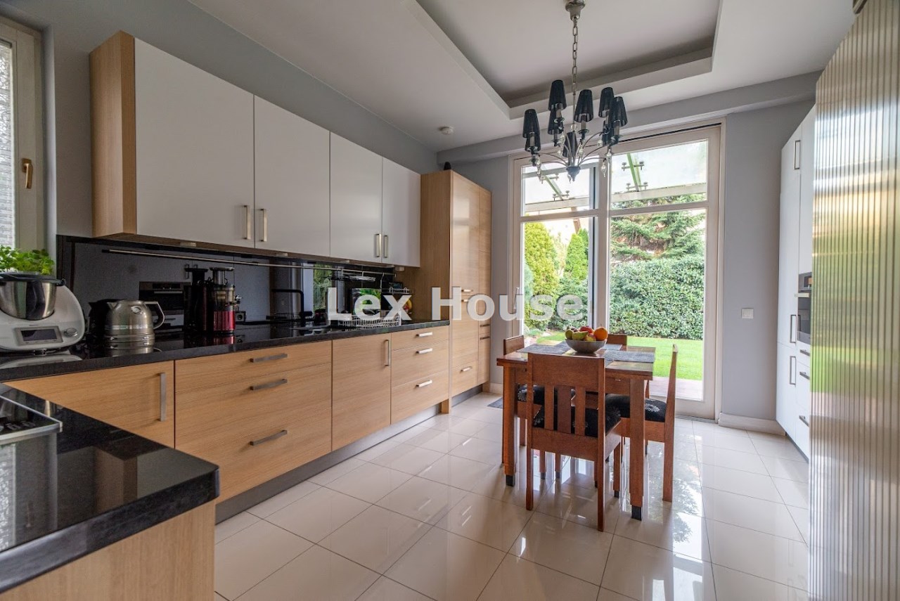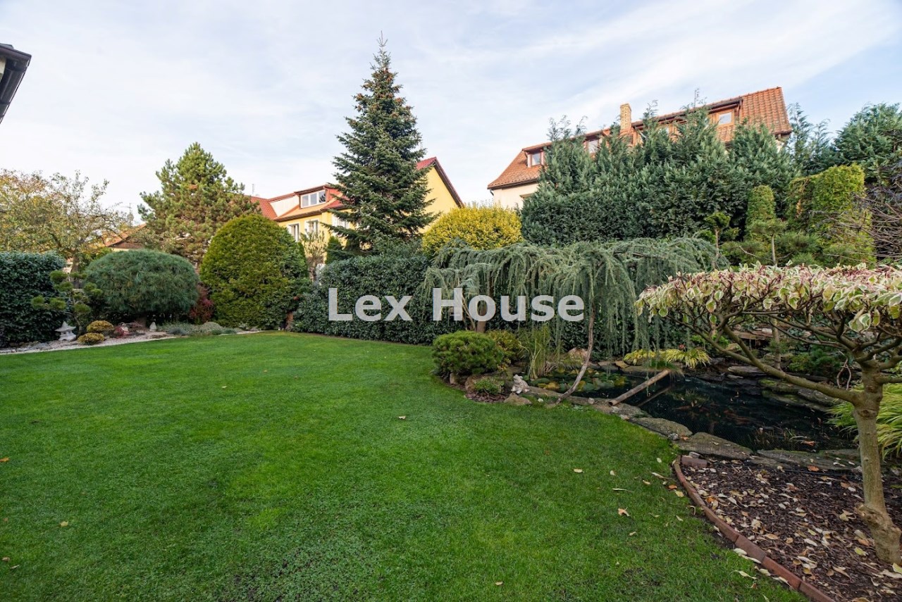 Nieruchomość usytuowana jest frontem do parku, na przepięknie zagospodarowanej działce o powierzchni 716 m² z oczkiem wodnym zarybionym, licznymi nasadzeniami i idealnie utrzymanym trawnikiem wyposażonym w automatyczny system nawadniania i robota koszącego.