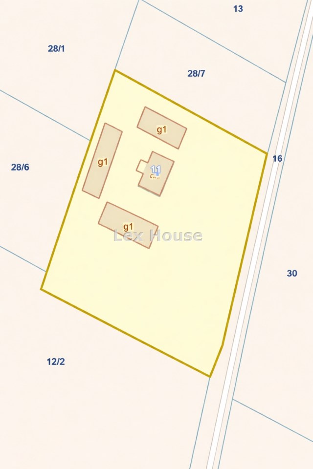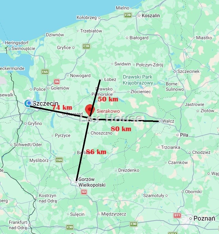 Działka nr 28/8 w Sierakowie o powierzchni 5 149 m² z zabudowaniami, w skład których wchodzą trzy lokale, w tym jeden mieszkalny, oraz budynek gospodarczy o powierzchni 120 m². Budynek mieszkalny z 1948 roku ma powierzchnię użytkową 42,86 m² i składa się z przedsionka, przedpokoju, łazienki, pokoju z aneksem kuchennym oraz drugiego pokoju. Nieruchomość położona w wiejskiej okolicy, w otoczeniu pól oraz zabudowy jednorodzinnej i siedliskowej, z dojazdem drogą lokalną. Odległości: Dobrzany – 7 km, Stargard – 26 km, Szczecin – 61 km, Gorzów Wielkopolski – 87 km.