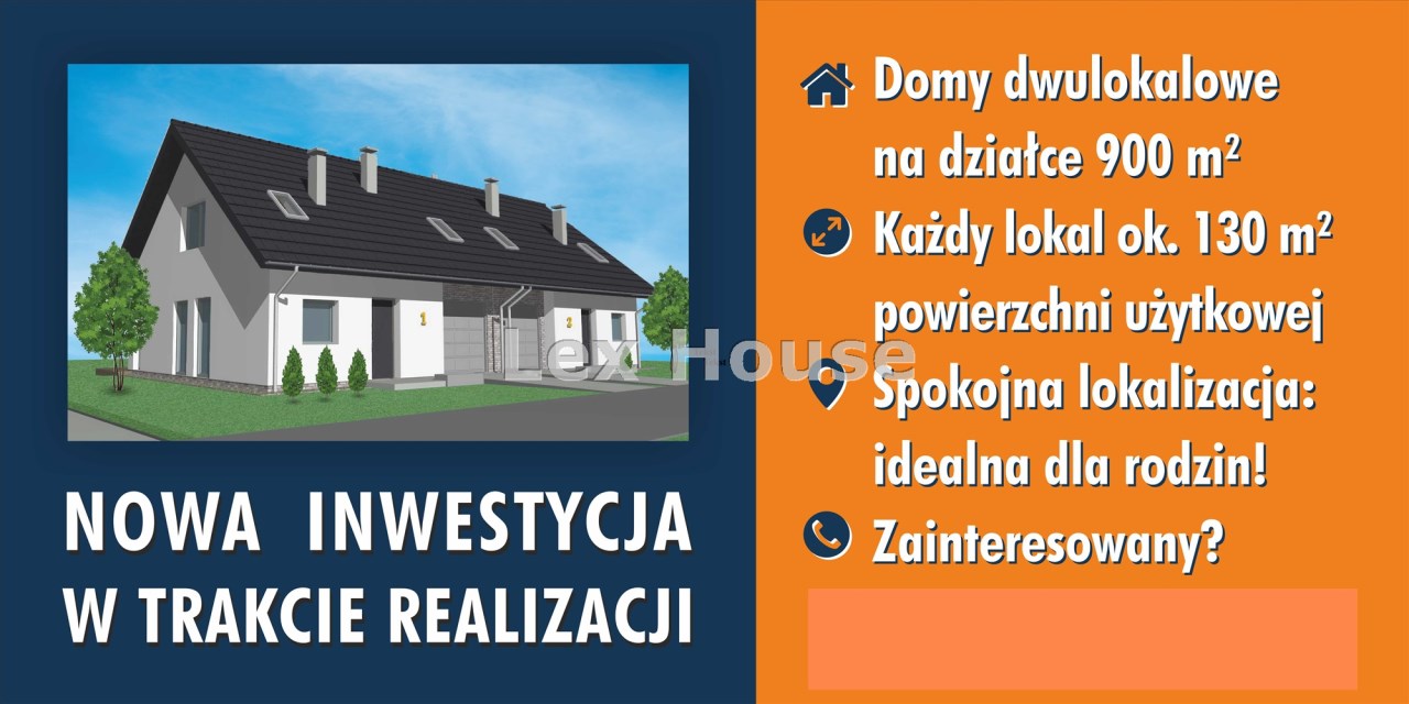 Dom jednorodzinny dwulokalowy na na działce 900 m2 , dla każdej połowy po 450 m2, każda połówka domu to ok.130m2 powierzchni użytkowej. W projekcie podwójna ściana z dylatacją między sąsiadami co jest wymagane w zabudowie bliźniaczej a czego nikt z deweloperów nie stosuje w przypadku budynków dwulokalowych. Dostępne media: prąd, woda z wodociągu miejskiego ( w trakcie budowy), gaz lub pompa ciepła, szambo. Budynki w stanie surowym zamkniętym z elewacją i mediami doprowadzonymi do budynku . Klient na tym etapie ma możliwość zastanowienia się nad rodzajem ogrzewania, jak również decyduje o wszystkim co będzie robił wewnątrz budynku przy jego wykańczaniu. Budynki do wydania w III kwartale 2025 roku