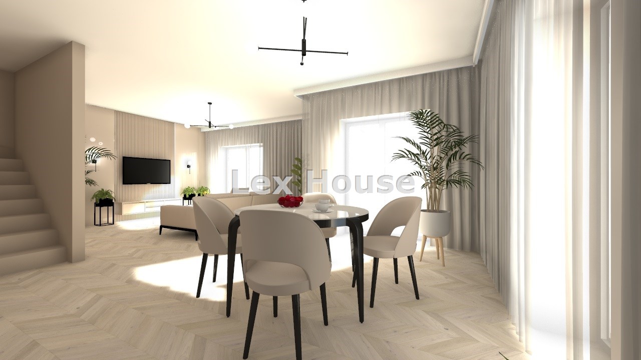 Parter: salon z kuchnią i jadalnią, wiatrołap, hol, WC, kotłownia