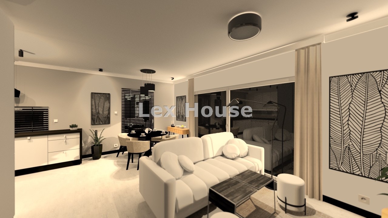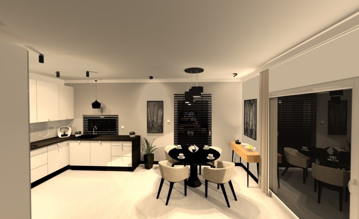 Parter: salon połączony z aneksem kuchennym, wyjście na duży taras, wc , holu przejście do