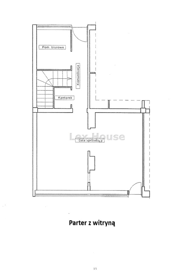 Parter: sala główna z witryną, biuro oraz kantorek. Łączna powierzchnia parteru 48,70 m2