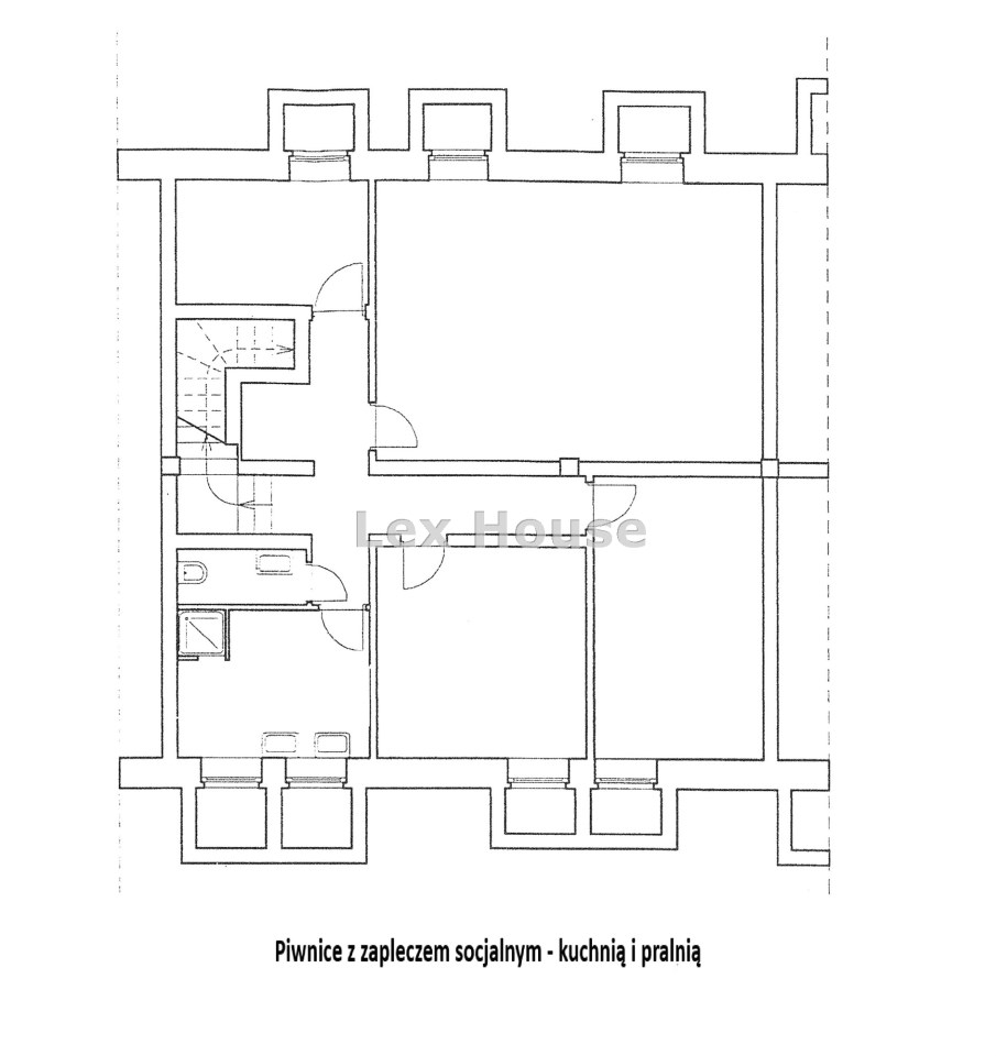 Piwnica: cztery pomieszczenia magazynowe, zaplecze socjalne z kuchnią i pralnią oraz wc. Łączna powierzchnia piwnic 81,30 m2.