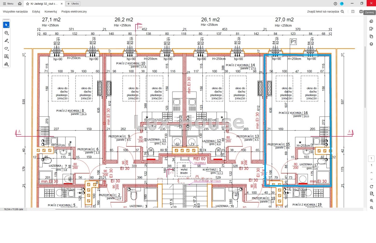 Mieszkanie o jednostronnej, zachodniej ekspozycji okien. Powierzchnia użytkowa wg. dokumentacji projektowej to 27,00 m2.