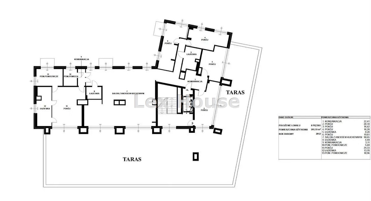 Powierzchnia mieszkalna 261 m2, dodatkowo taras 319 m2, 3 balkony o pow. 2,73 m2 każdy, 3 miejsca postojowe plus 2 pomieszczenia gospodarcze.