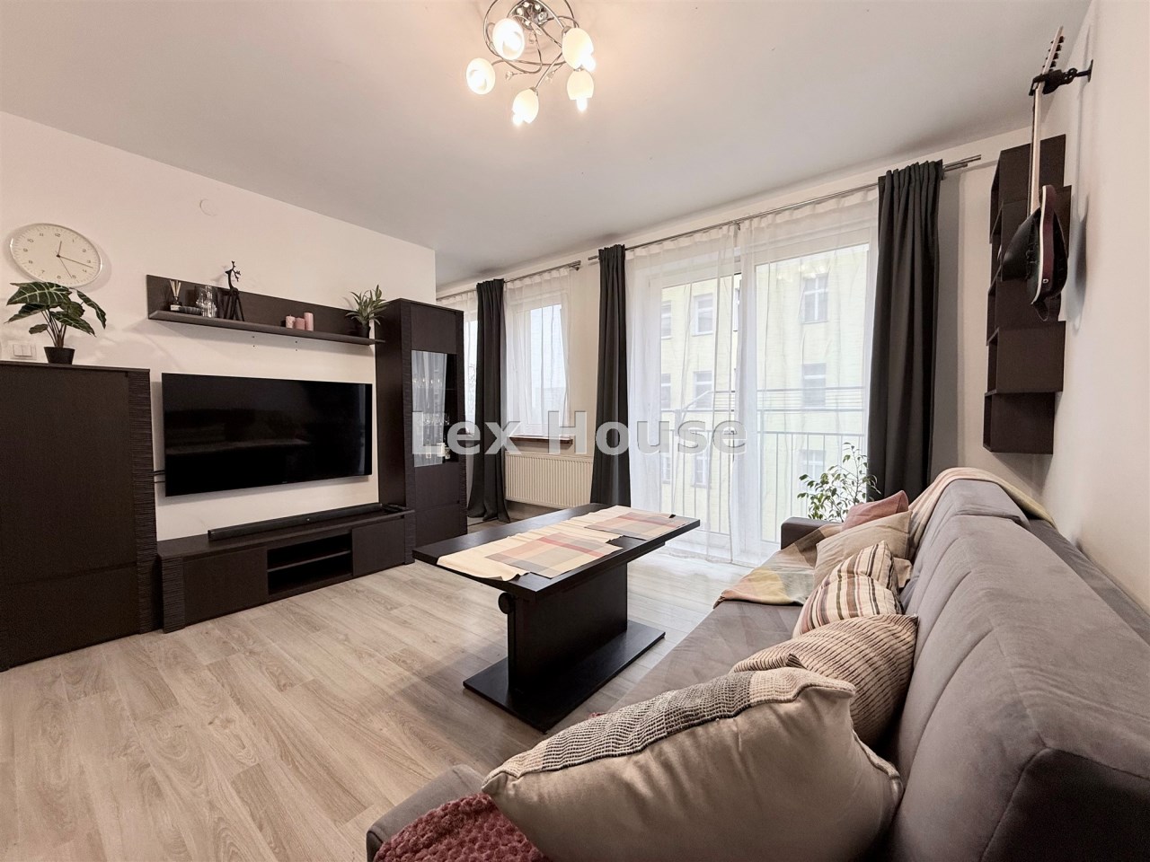 przestronny salon z kratką balkonową