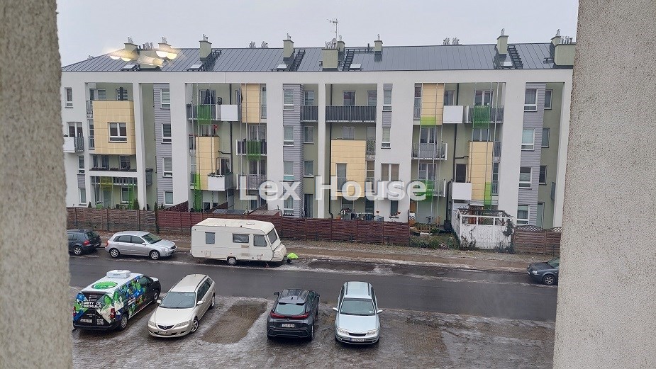 Okna PCV z widokami na podwórze/parking od strony ulicy oraz na skwer zielony wewnątrz osiedla z sypialni.