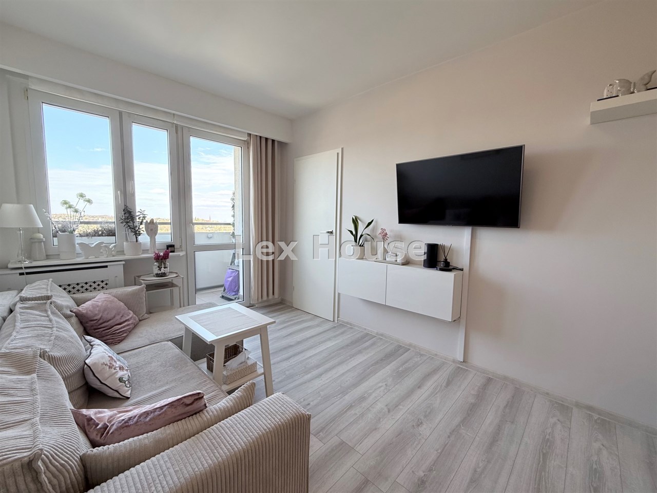 Dużym atutem nieruchomości jest balkon z widokiem na panoramę miasta, który zapewnia świetne doświetlenie oraz przyjemne miejsce do relaksu.