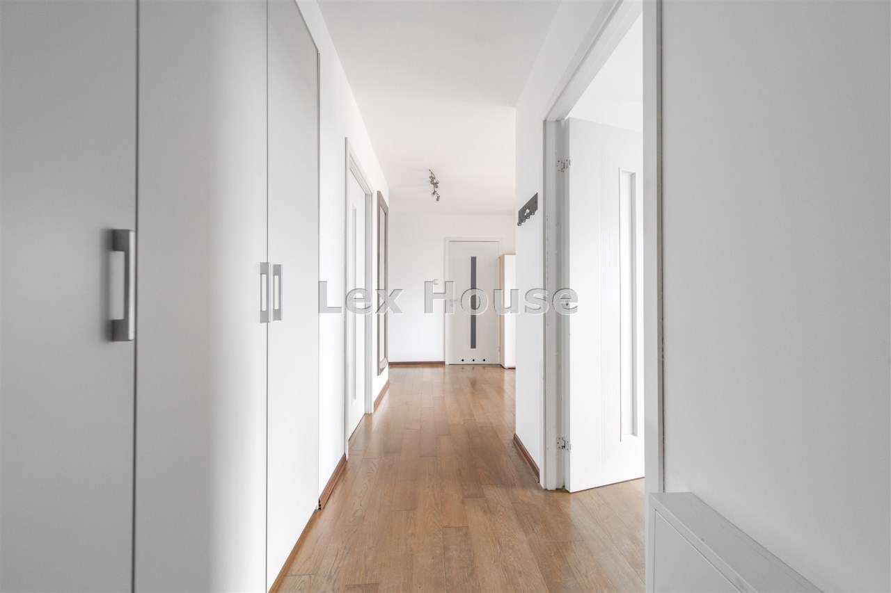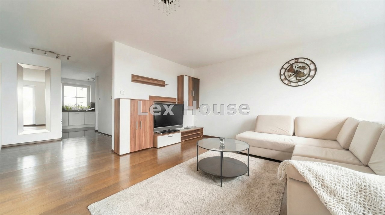 Wnętrze jest jasne i przytulne, a drewniana podłoga w kolorze ciemnego orzecha nadaje mieszkaniu elegancki charakter. Balkon stanowi dodatkową przestrzeń do wypoczynku.