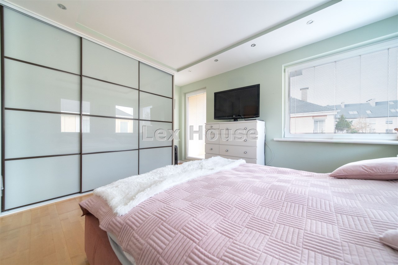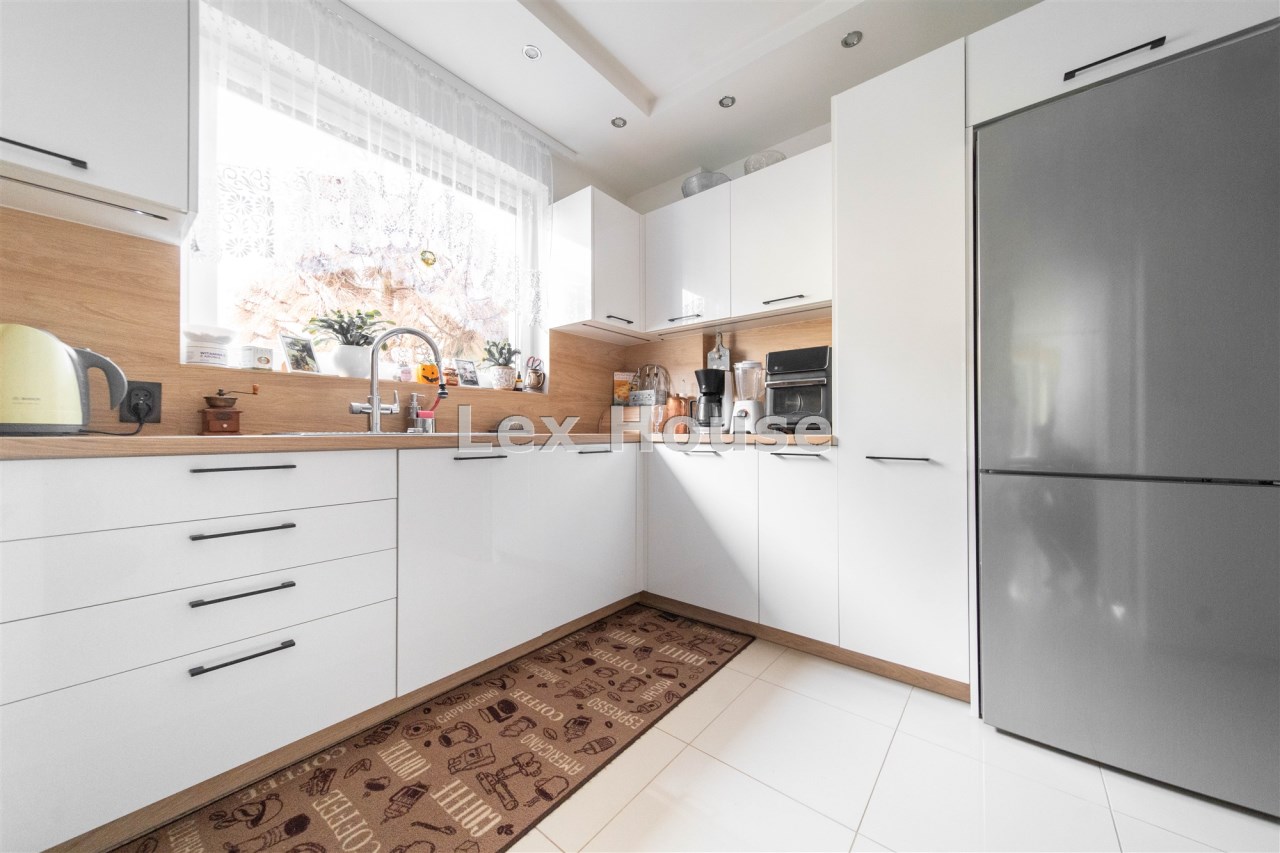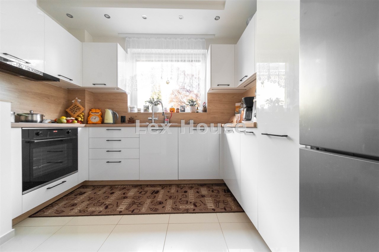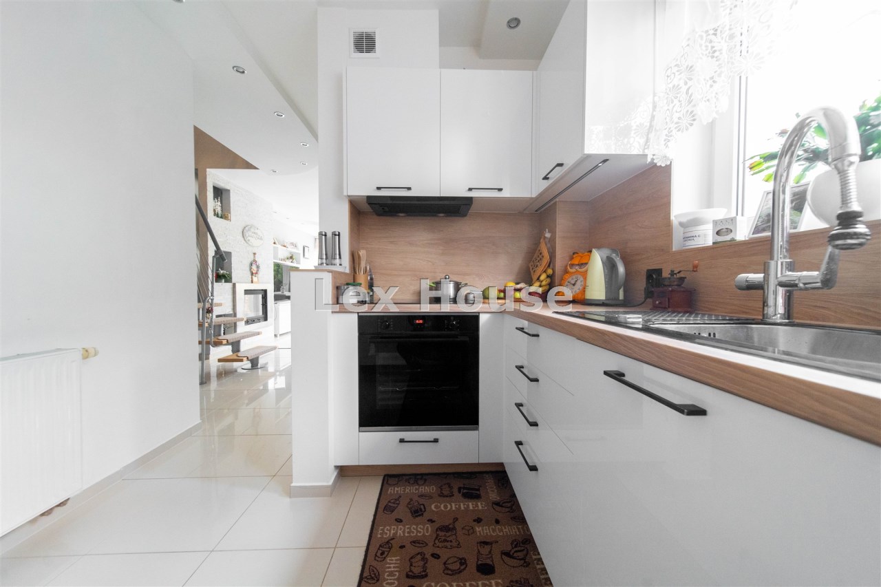 Kuchnia w nowoczesnej zabudowie, ze sprzętem AGD. Salon z kominkiem, jasny z ładnie zaprojektowanym oświetleniem. Na tym poziomie znajduje się również toaleta z umywalką. Z poziomu 0 schodami wchodzimy na 1 piętro o powierzchni 37 metrów. Znajdują się tam dwie duże sypialnie, każda z balkonem oraz duża łazienka/pokój kąpielowy z prysznicem i wanną.