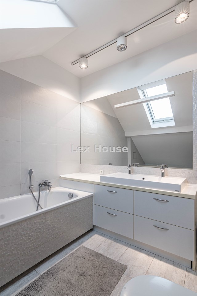Mieszkanie w bardzo dobrym standardzie, na podłogach panele, okna PCV, na wyższych poziomach drewniane, połaciowe. Ściany gładzone, malowane. Schody prowadzące na kolejne poziomy z litego drewna. Stolarka drzwiowa wewnętrzna, bezprzylgowa z zamkami magnetycznymi. Powierzchnia całkowita mieszkania to 150,00 m2.