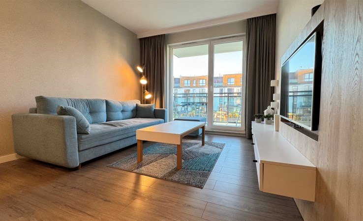 Przestronny salon z aneksem kuchennym i wyjściem na balkon,