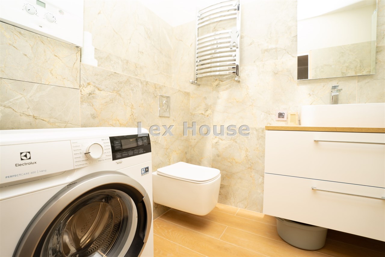 łazienka z kabiną prysznicową, na wyposażeniu pralka.