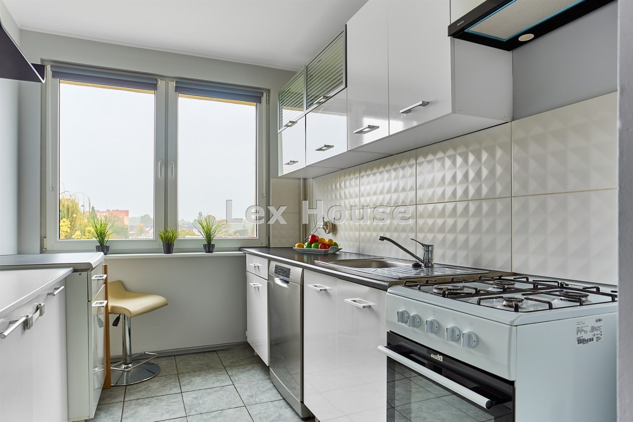 W kuchni znajdziemy meble, kuchenkę gazową, lodówkę, zmywarkę