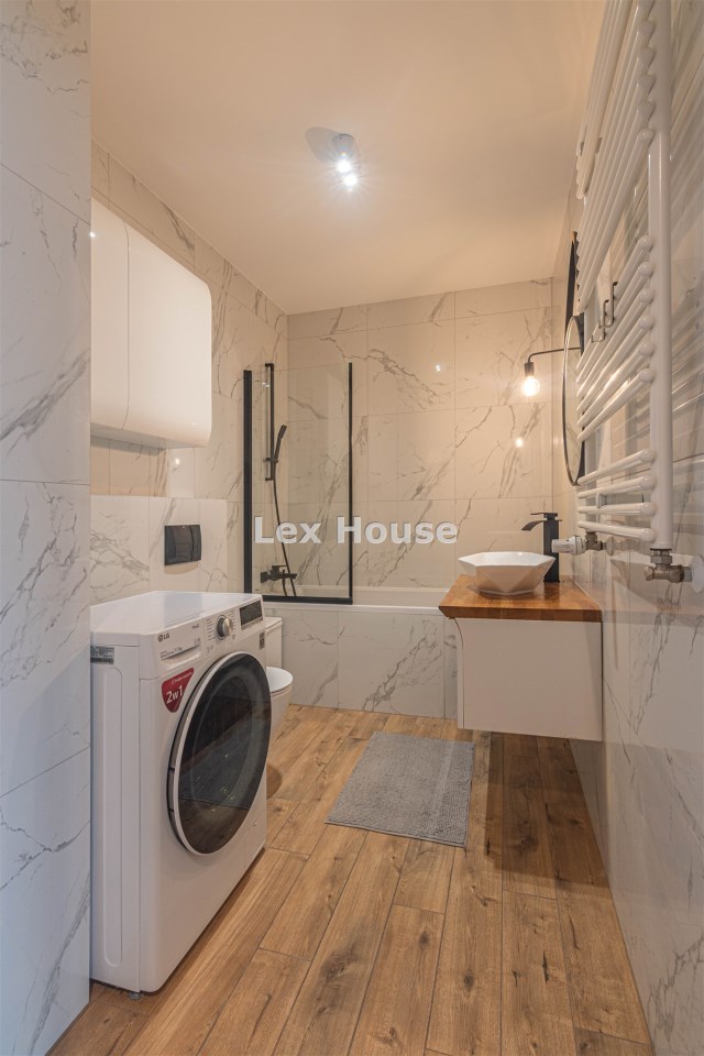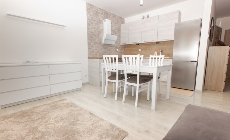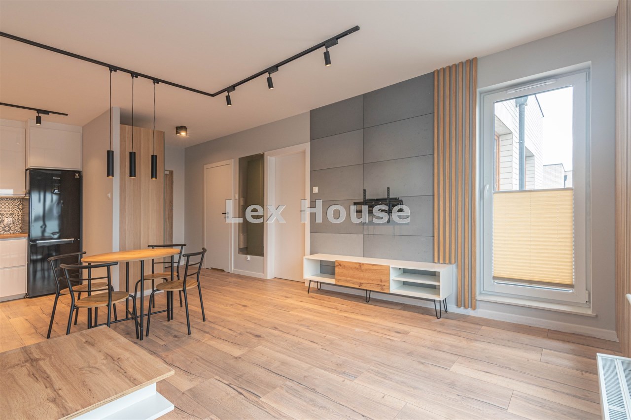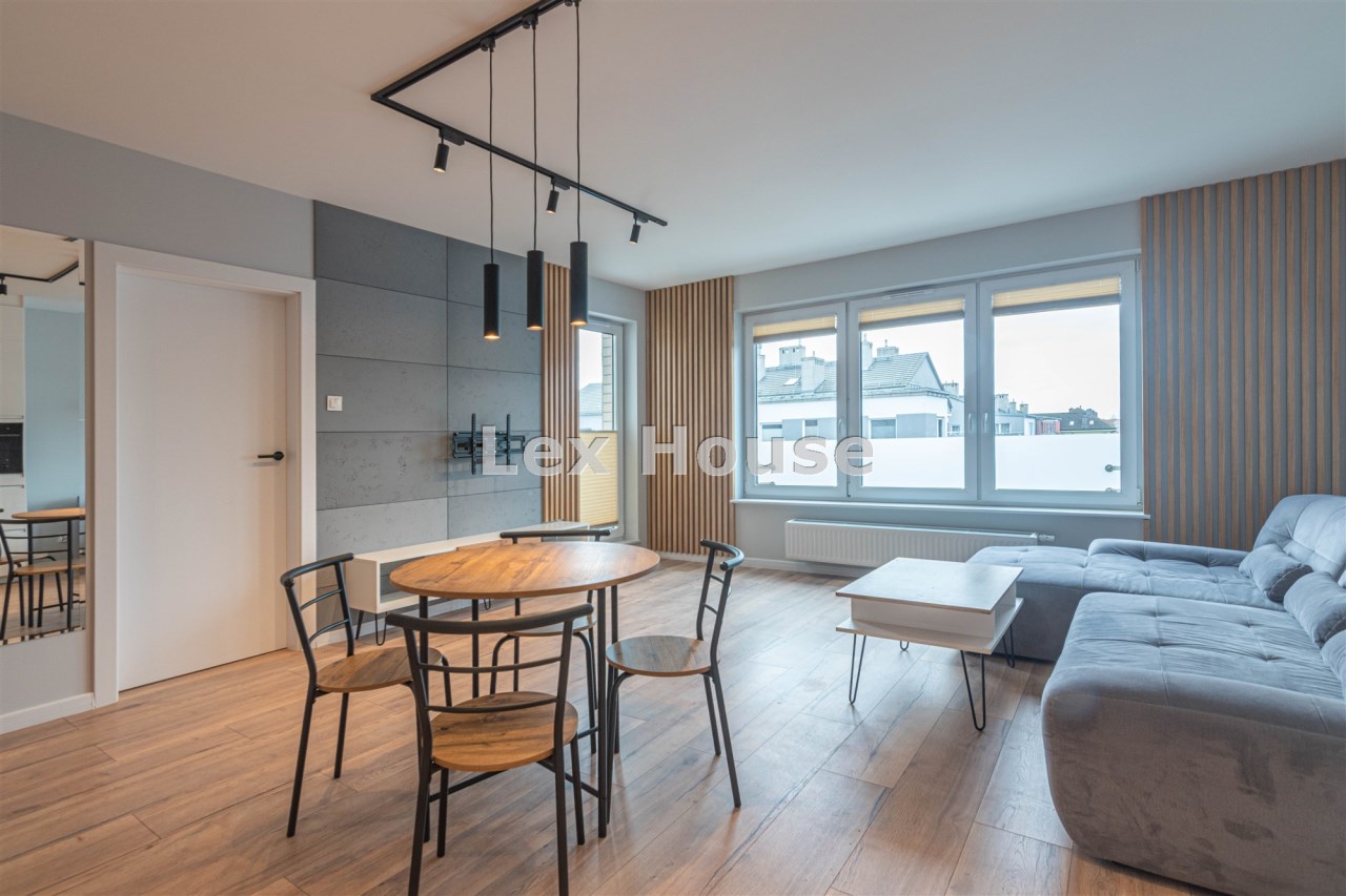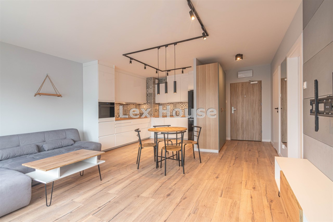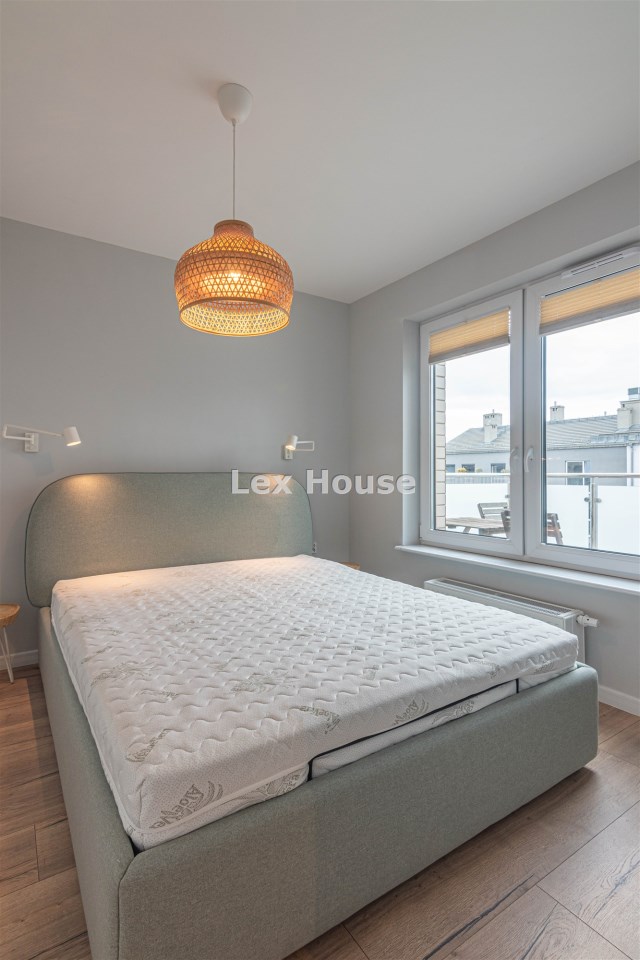 Mieszkanie położone na czwartym piętrze niskiego budynku z 2022 roku. Lokal w bardzo dobrym standardzie: ściany gładzone - malowane, na podłodze panele, okna PCV. Pokój dzienny umeblowany. W sypialni duże łóżko i szafa w zabudowie. Kuchnia w formie aneksu, umeblowana i wyposażona w sprzęt AGD (płyta indukcyjna, piekarnik z funkcją mikrofali, zmywarka, okap, lodówka z zamrażarką).W przedpokoju kolejna szafa. Łazienka razem z wc, wanna, zasłona prysznicowa, pralka.