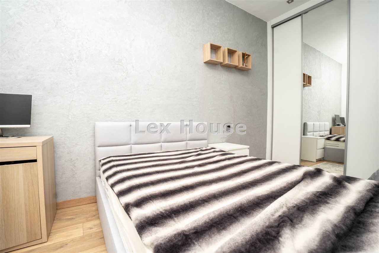 W salonie okrągły stol z krzesłami, rozkładana kanapa. W kuchni indukcja, zmywarka. Sypialnia z dużym łóżkiem oraz kącikiem do pracy (światłowód w całym mieszkaniu). Na jednej ścianie garderobiana szafa.