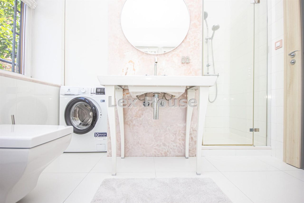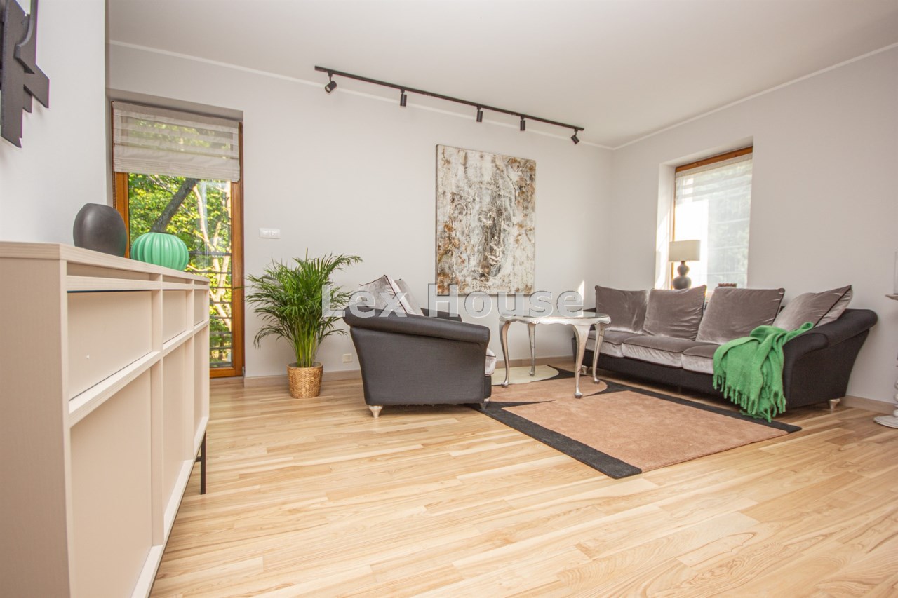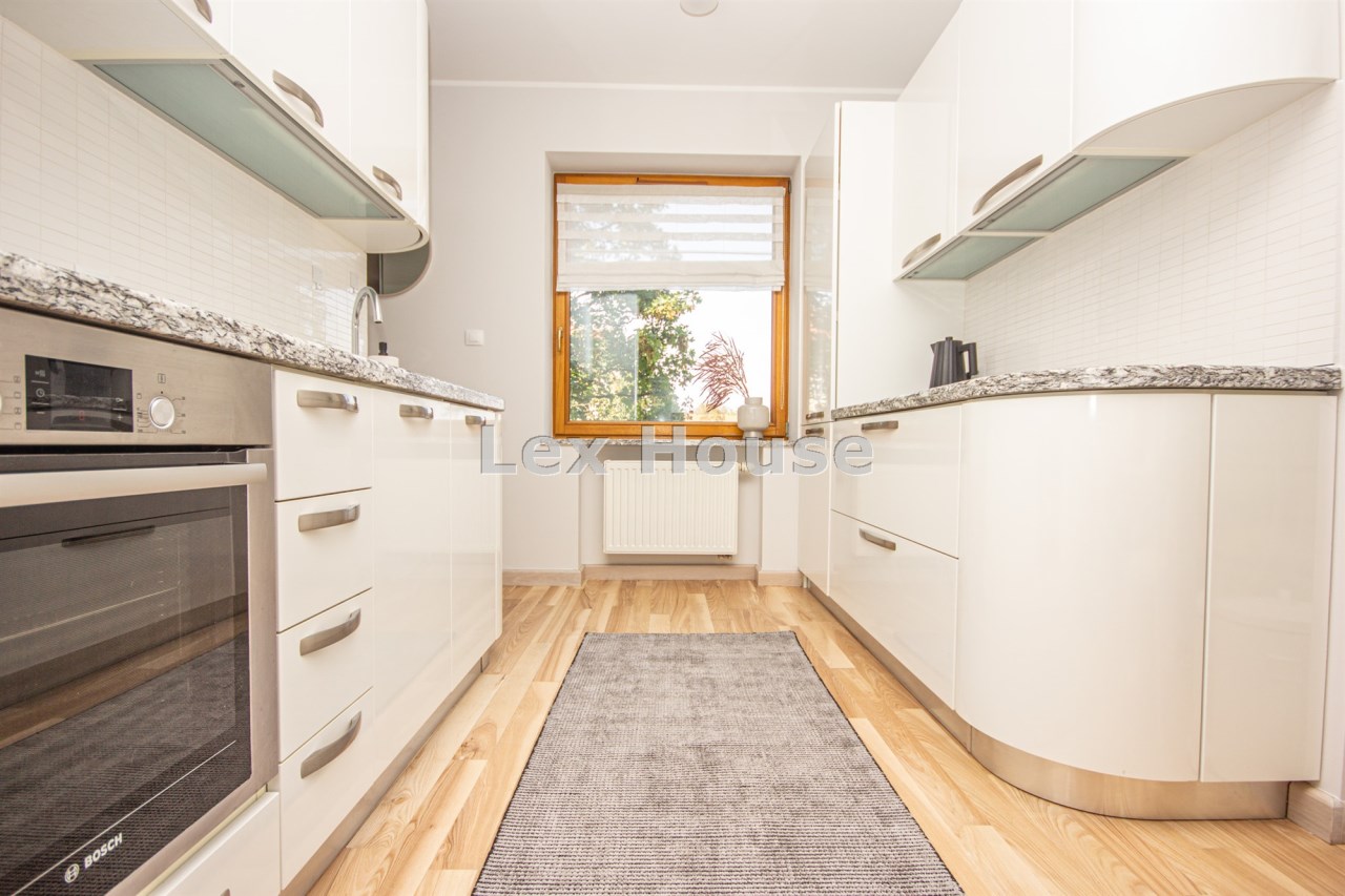 Zostało urządzone z najwyższej jakości materiałów z gustem i dbałością o detale – drewniane podłogi, wełniane dywany, kamień naturalny w kuchni i łazience, designerskie oświetlenie i dodatki.